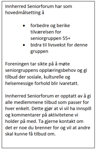 Innherred Seniorforum er en forening med medlemmer fra 55 år og oppover. Formålet vårt er å gi medlemmene tilbud som beriker hverdagen. Vi skal gi tilbud der sosiale, kulturelle og helsemessige forhold blir ivaretatt. For å bli medlem betaler du en engangskontingent på 300 kr.